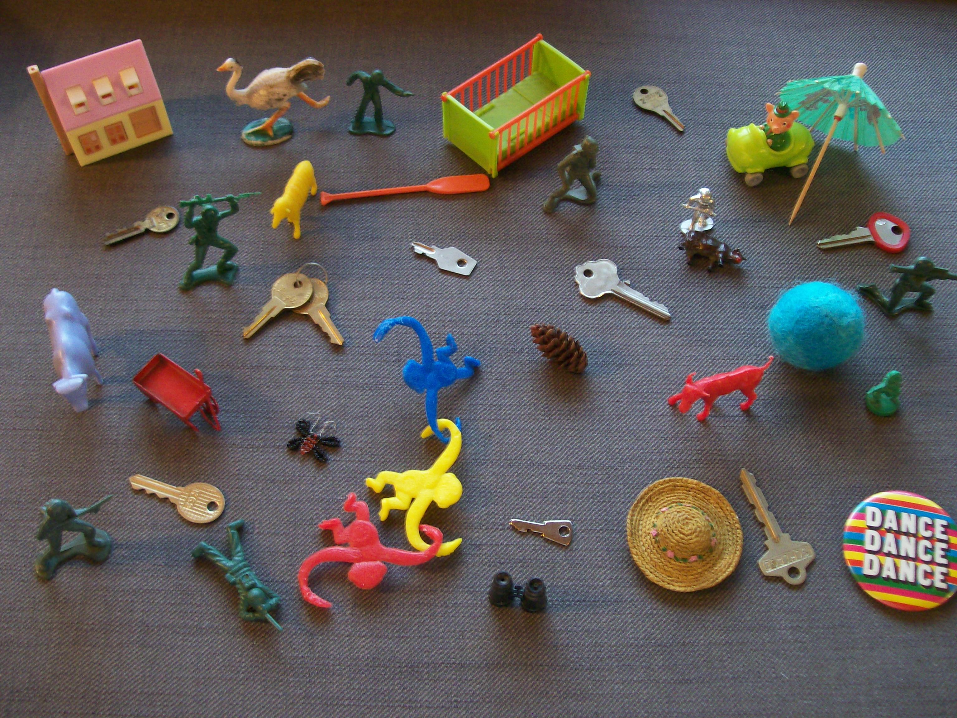 Just take a collection of small objects from around your home and make up your own rhymes including some of the objects. Dig through that junk drawer and clean out the bottom of the toy box. The group of objects can have a theme if you want, such as “at the zoo” or “on the farm”. Or, you can focus on colors and counting, like I did here.