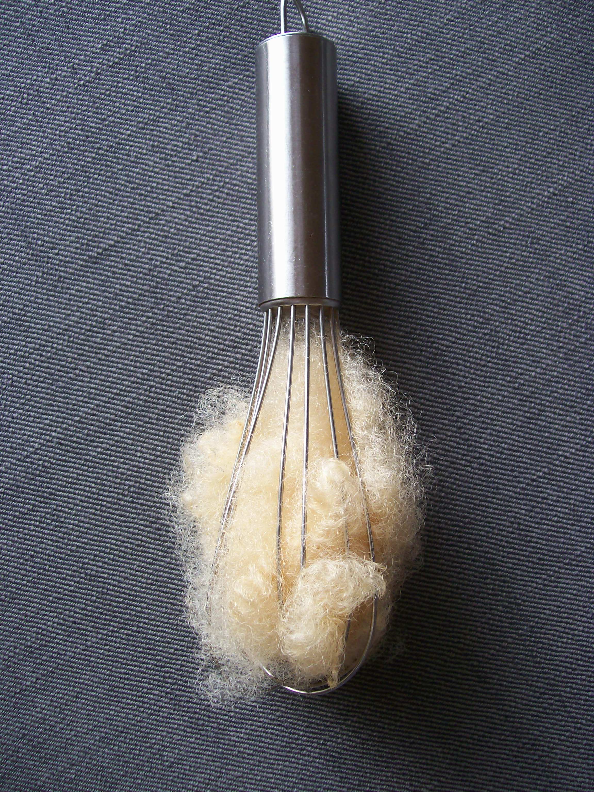 I’ve been watching several bird couples building nests around my yard. A great follow-up to this book is to give the birds a little help in finding nesting materials. Gather some narrow strips of natural fabric and yarn, small twigs, shredded paper, straw, moss, even dog hair. For a container, use a mesh produce bag and hang it from a tree. Or, just set the materials in a box outside. If you have an extra whisk in your kitchen, fill it with some nesting materials and hang in from a branch. Here is one that’s all ready to go, filled with wool roving.